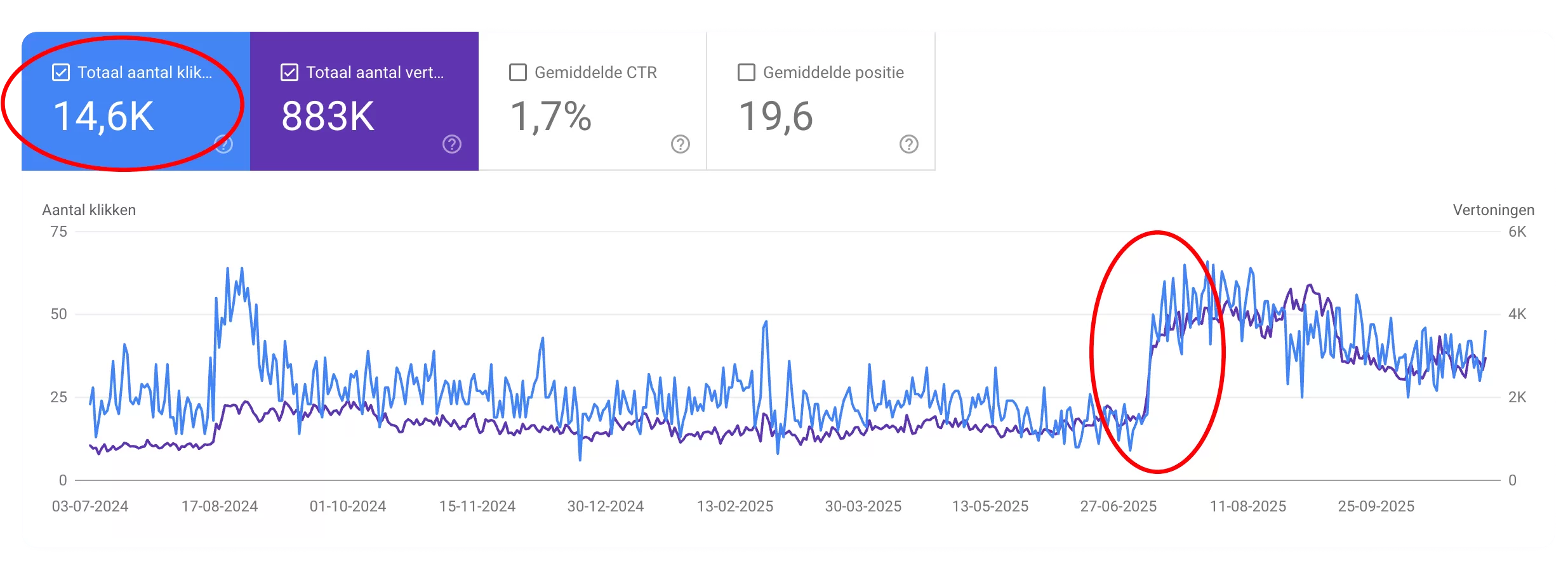 We optimaliseerden de site a.d.h.v. alle SEO “best practices” anno 2025. Kort daarna zagen we een sterke stijging in zowel vertoningen als kliks in Google.